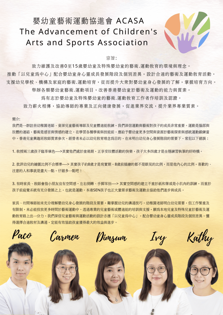 我們是一班具有專業認證及經驗的本土教育家、藝術家與藝術導師,致力薪火相傳,維護導師的專業及正向健康發展,促進業界交流,提供各類藝術活動及導師發展培訓 (歡迎自組活動,機構合作)